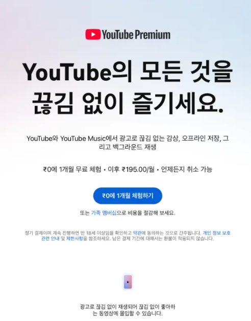 ๋ก๊ทธ์ธํ๋ฉด ์ ํ๋ธ ํ๋ฆฌ๋ฏธ์ ๊ฐ์ ์๋ด๊ฐ ๋น๋๋ค. ๋ฃจํผ๋ก ๋์ค๋ฉด ์ฑ๊ณต!